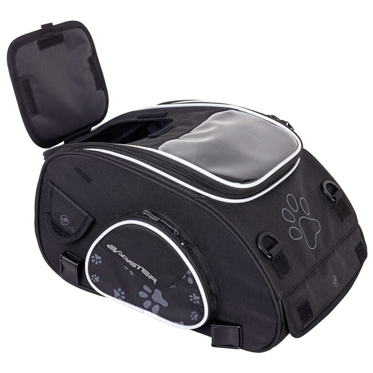 Die PUPPY (Klein-)Tasche ist für kleine Hunde geeignet. Es bietet die gleichen Funktionen wie seine große Schwester mit seinen drei Belüftungsluken (zwei Seiten und eine zum Piloten zugewandt) und verfügt über traditionelle Befestigungselemente, mit denen Sie den Beutel an einem Tankschutz befestigen können.