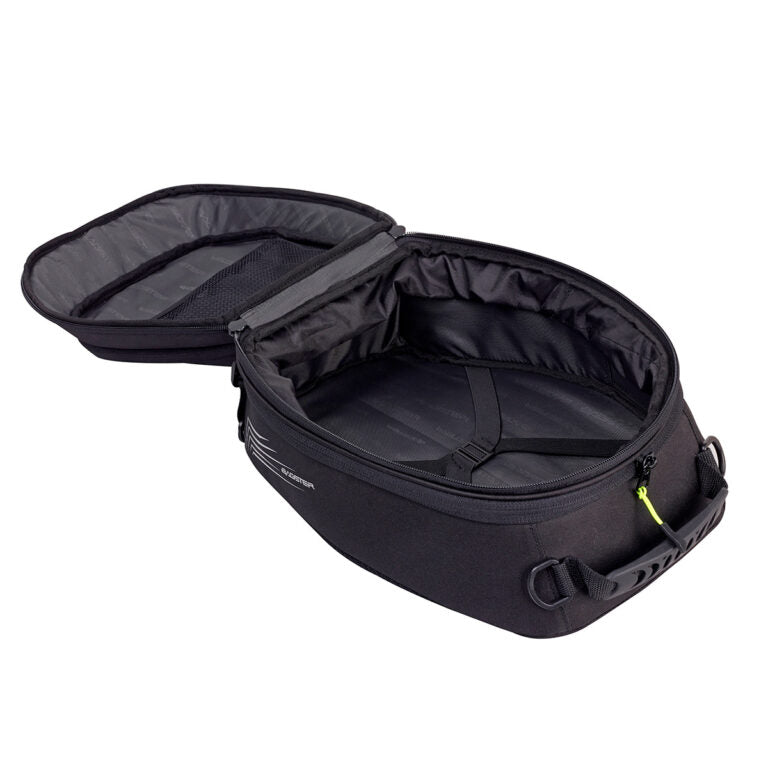 Die SIGNATURE LOCK Tasche ist ideal für den täglichen Gebrauch mit ihrem Volumen von 28 L (offener Faltenbalg). Es verfügt über viel Stauraum, bietet ein großes Volumen, das einen Helm aufnehmen kann und ist mit dem LOCK’N START-System fixiert